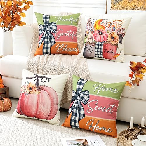 Artscope Fall Decorative Throw Pillow Covers 18x18 Inch Set of 4 Fall Gifts for Home Decor, Autumn Pumpkin Sweet Home Thankful Grateful Blessed Outdoor Farmhouse Pillow Cases for Sofa Couch-Blue(Pink,18" x 18" (Pack of 4))