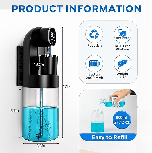 【Large 600ml Visible Mouthwash Container with LED Display】:Designed with a 600ml mouthwash container, this mouthwash dispenser for bathroom reduces the need for frequent refills. The transparent water tank makes it easy to monitor the remaining amount, while the LED screen clearly shows the dispensing mode and battery status, ensuring a user-friendly experience.