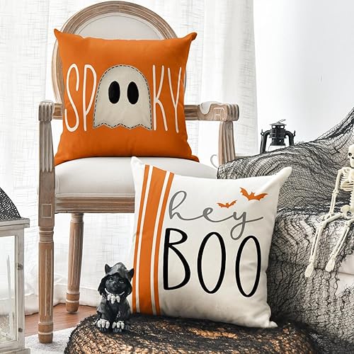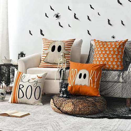 AVOIN colorlife Halloween Hey Boo Cute Ghost Spooky Throw Pillow Covers, 18 x 18 Inch Horror Scary Cushion Case for Sofa Couch Set of 4, Black(Orange,18" x 18" (Pack of 4))