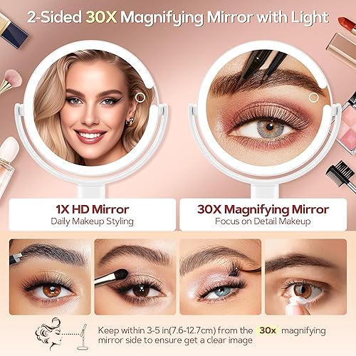 Magnifying Mirror with Light: This dual-sided design features a 30X magnifying side for precise tasks like eyebrow grooming, eyelash application, and blackhead removal, plus a 1X standard side for everyday makeup. It includes precision tweezers for detailed work, making it ideal for makeup enthusiasts, skincare lovers, individuals with poor eyesight, and those over 40. A best-selling item for the elderly and mature users, yet versatile for all ages.When using a 30X magnifying mirror, your eye needs to be within 3 inches of the mirror to obtain a clear view.