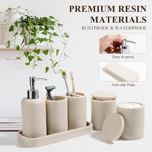 【Sturdy bathroom set】: The sturdy polyresin construction of our soap dispenser and toothbrush holder ensures long-lasting durability. Keep your bathroom organized with these stylish organizers.