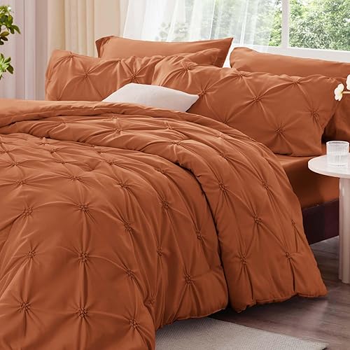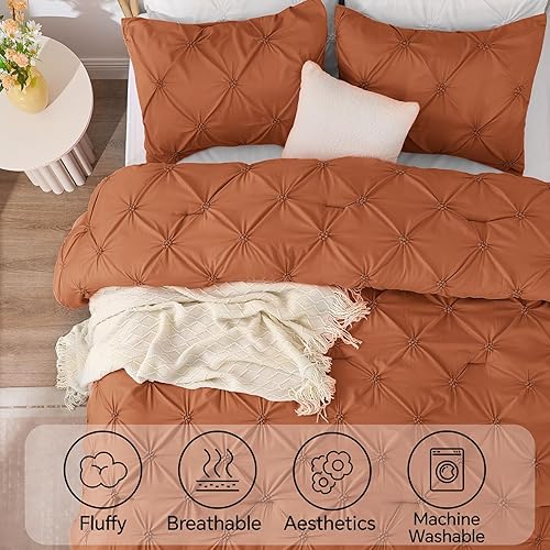 BEDELITE Pink Comforter Set Queen - 3 Pieces Boho Pintuck Bedding Comforter Sets, Lightweight Soft & Warm Bed Comforter Queen with 2 Pillowcases for All Season(Burnt Orange,Queen(88"x88"))