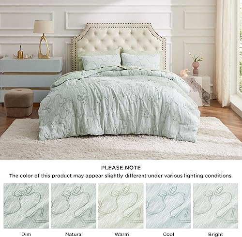 Bedsure Queen Comforter Set, Pink Boho Tufted Bed Set, 3D Puffy Jacquard Bedding Queen Size, 3 Pieces, 1 Farmhouse Shabby Chic Embroidery Comforter with Bow Pattern & 2 Pillow Cases(07 - Sage Green - Bow,Full)