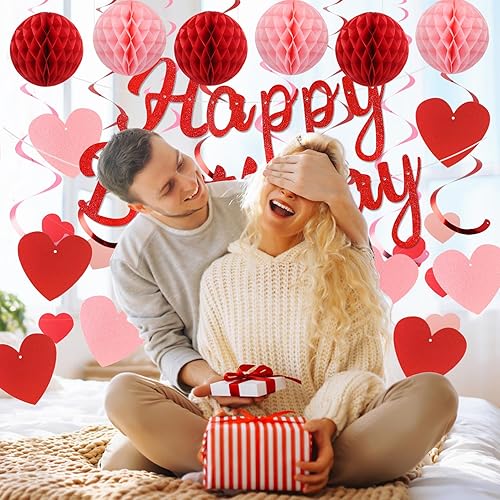 Birthday Decorations, NO DIY, Pre-Strung Happy Birthday Banner with Honeycomb Balls, Hanging Swirls, Circle Dots Garland, Happy Birthday Party Decorations for Women Men Boys Girls (Pink)(Red)