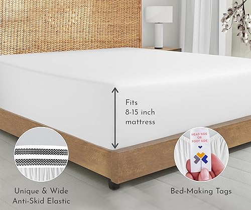 DEEP POCKET FOR A SNUG FIT - The White Queen size fitted sheet is equipped with super strong all around elastic so it perfectly hugs your mattress and doesn't bunch up. The non-slip fitted sheet stays put all night without popping off and has a versatile fit, making it suitable for both tall and low profile memory foam mattresses. The smart head and foot labels ensure super easy, hassle-free bed making.