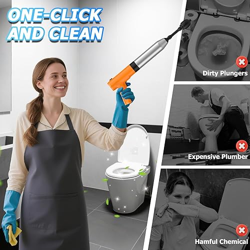 JUST ONE CLICK AND CLEAN: Say goodbye to plumbing headaches! This air pressure toilet auger features a built-in electric air pump that inflates the device at the push of a button, reaching 5 Bar in just 20-30 seconds. Whether it’s a busy morning or late at night, this toilet plunger with holder saves you time and energy without waiting for a plumber.