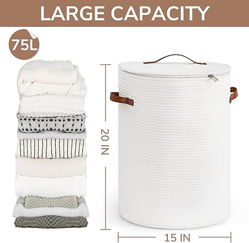 CHICVITA Tall Laundry Basket with Lid, Large Laundry Hamper for Bedroom, Laundry Bin for Clothes, Blankets, Toys, Decorative Woven Basket for Living Room, 15 x 20 inches, Black(White)