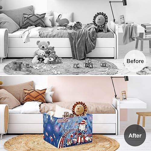 Clastyle Memorial Day Land of The Gift Basket Retro America Flag Patriotic 4th July Storage Bin Baby Toy Book Shelf Basket Beach Clothes Towel Basket, Fireworks Gnome, 40*30*30 cm