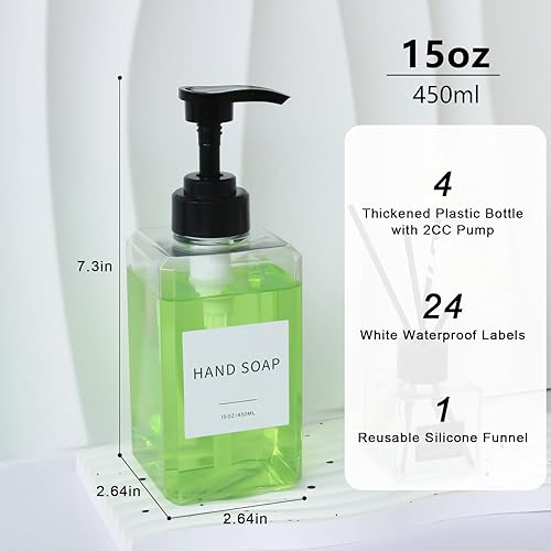 Safety Material: These hand soap bottles are made of extra thick PETG plastic, heavy duty and durable, will not break easily and are comfortable to hold. Each bottle has a large capacity - 15 oz and can hold hand soap, dish soap, shampoo, conditioner, lotion. (Package includes a silicone funnel to assist refill liquid.)