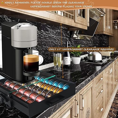 [ SPACE SAVING, COMPACT DESIGN] 2.5 times capability of other Nespresso Vertuo pods drawer holder. This Nespresso pods holder is designed in a small footprint (12.88” Width x 14.75” Depth) but having unbelievable large capacity of 50 Nespresso 8 FL. OZ VertuoLine pods. However, other branded drawer organizer only holds 25 pods with a width of almost 13.5”;