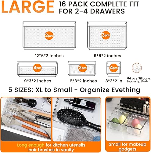 【LARGER SIZES】With 5 sizes (large to small), our 26 pack clear drawer organizers could hold more gadgets, large and long enough to hold kitchen utensils, silverware, household tools and more. Includes: 4 pack large drawer organizer trays 15x6x2 inches, 5 pack 9x6x2 inches, 5 pack medium 6x6x2 inches, 6 pack small 6x3x2 inches, 6 pack 9*3x2 inches.