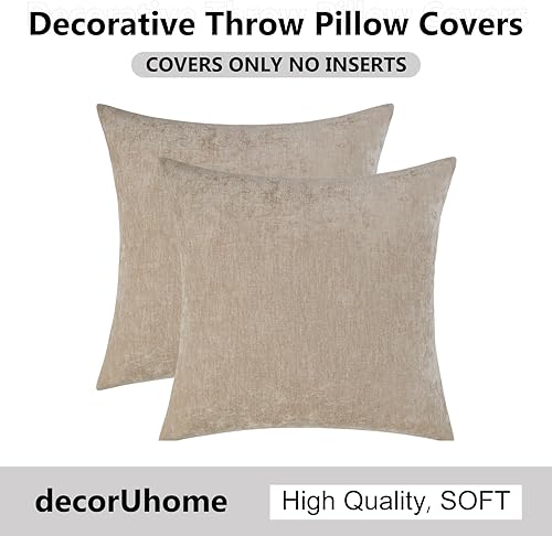 decorUhome Chenille Moss Green Fall Throw Pillow Covers 18x18 Inch Set of 2, Decorative Soft Couch Pillow Covers Solid Dyed Accent Velvet Farmhouse Neutral Square Christmas Pillow Cases for Sofa(Beige,18" x 18" (Pack of 2))