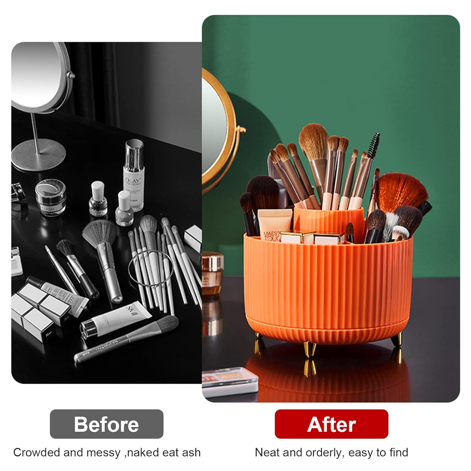 Premium Material Swivel Makeup Brush Holder:The Swivel makeup brush holder is made of durable Premium plastic, which ensures its durability and security from injury and breakage. And the smooth surface and rounded edges won't cause any harm to your desk or yourself.Cosmetic storage box requires no installation and can be used directly.
