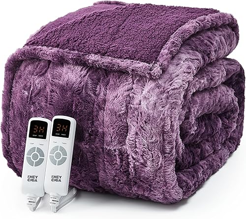 EHEYCIGA Electric Heated Blanket Throw Faux Fur, 10 Hours Auto Shut Off 9 Heating Levels Heating Blanket Throw, Soft Warm Heated Blanket Fast Heating, Faux Fur & Sherpa(Purple,King)
