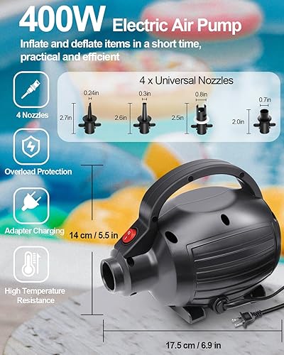 Efficient Electric Air Pump: 400W high-power design, working voltage is AC 110-120V, air pressure can reach 2.5psi/17000pa, the electric pump can quickly fill the oversized inflatable air mattress in just 2-3 minutes, which is much more efficient than traditional manual air pumps and saves a lot of time.