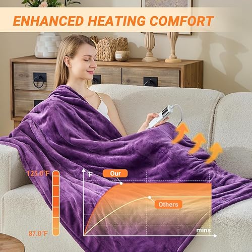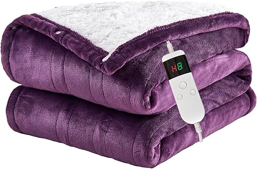 Electric Blanket Heated Throw, Soft Flannel 50"x60" Heating Blanket with 8 Hours Auto Off 10 Fast Heating Levels Machine Washable Sherpa Heated Blanket with Overheating Protection(Purple,Throw(50" x 60"))