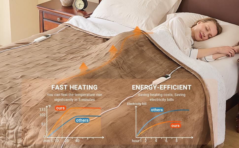 Soft & Skin-Friendly: Made from plush flannel on one side and cozy sherpa on the other, this heated blanket offers luxurious softness and excellent insulation. It feels warm and inviting even without power—perfect for snuggling up on chilly days or winding down after a long day.