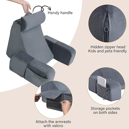 [Every Detail in Mind]: Our back pillow for bed sitting up features cozy, soft fabric for maximum comfort, handy pockets on the armrests for convenient storage, a smooth removable cover that's machine-washable for easy cleaning, and a top handle design for effortless portability, allowing you to move it around with ease. Enjoy comfort and convenience at its finest with our thoughtfully crafted reading pillow!