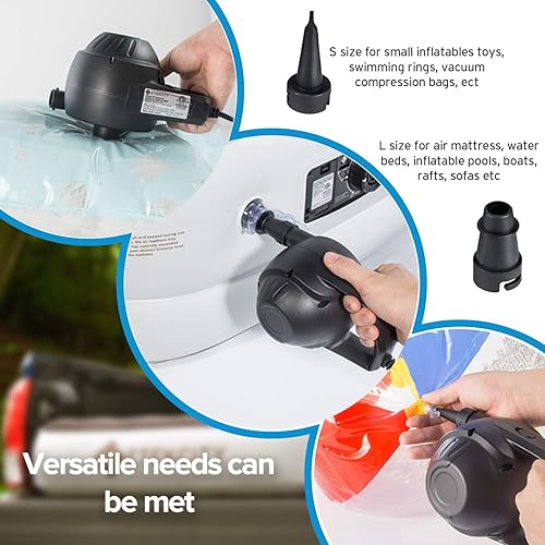 INTERLOCKING NOZZLES: The air pump with extra long AC power cord length 1.6M/5.3ft and 3 different sizes of nozzles --S (0.28''), M (0.68''), L (0.71'')--can fit most inflatables you need; the portable pump's nozzles stay lock-secured without losing air