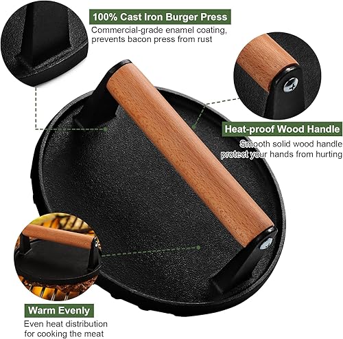 【SAFE-TOUCH ,COMFORT-GRIP WOOD HANDLE】: Wooden handle, has ergonomic design to reduce hand fatigue while ensuring a secure and comfortable grip. Made of natural wood, the handle of meat press is smooth without any burrs, insulate heat transfer that's heat-proof and always remain cool to touch. Firmly attached to the cast iron smash burger press with two screws.