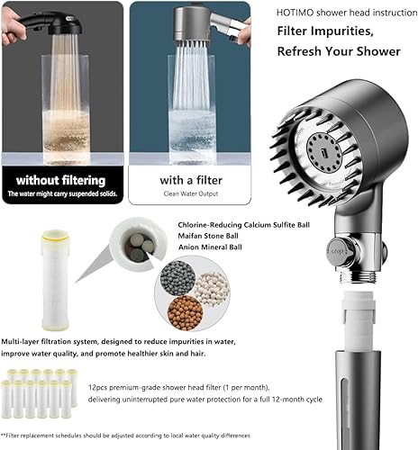 【FILTERED SHOWER HEAD】: 12 Replaceable Water Softener Filters. Upgrade your bathing experience with the Shower Head with filters for hard water. Multi-layer filtration system,designed to reduce impurities in water, improve water quality,and promote healthier skin and hair. The easy installation process ensures you can start enjoying fresher showers in no time. We recommend that you replace the filter cartridge every 1-2 months depending on water quality and usage.