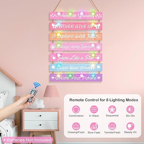 Package: The play room decor for kids package includeds 1 pcs girls room decor board, 1 pcs LED light with empty battery box (not including batteries), 1 pcs remote control (not including batteries), both do not including batteries, need to be purchased by customers themselves