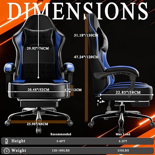 Premium Pc Gaming Chair: Faux leather big and tall gaming chair for prolonged sitting. Gaming desk chair ditch the cheap PVC material, skin-friendly and soft leather material that is resistant to scratches, stains, peeling, and cracking, while also being breathable. Massage gaming chair is padded with high-density cold molded foam to ensure a comfy seating experience, that will retain its form after long periods of use