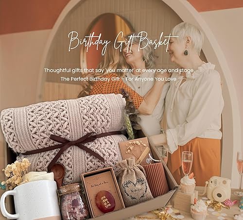 COMPLETE GIFT SET: Thoughtfully curated care package featuring a soft knit blanket, ceramic two-tone mug, bath salts, scented candle, and inspirational message card,With its earth tone color scheme, it is gender neutral.