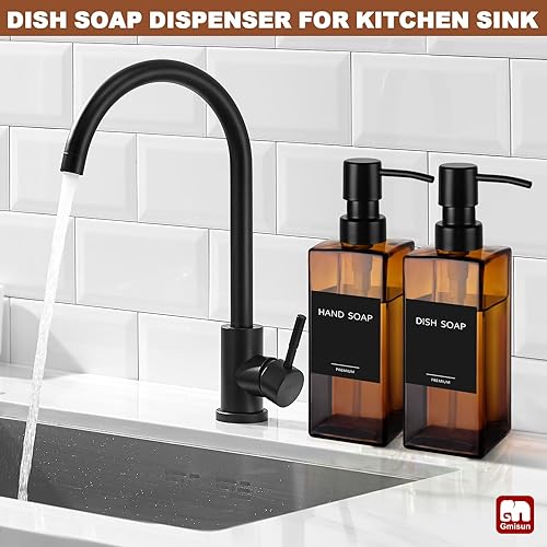GMISUN Black Soap Dispenser Bathroom, Glass Hand Soap Dispenser with Stainless Steel Pump, 12 fl oz/350ml Refillable Dish Dispensers for Kitchen, Modern Liquid Lotion Bottles for Bathroom Countertop(Amber Bottle + Black Pump,2 Pack)