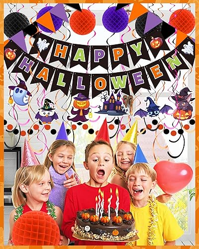 • PACKAGING SET: The Halloween party decorations including all stuffs you need for happy Halloween party: 1 pcs 7.2 ft Happy Halloween banner, 1 pcs 6.5 ft triangle flag banners, 12 pcs hanging swirls, 1 pcs 12.3 ft circle dots garland, 6 pcs tissue poms, 28 pcs accessories.