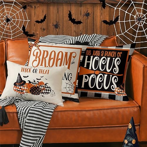 Halloween Pillow Covers 18x18 Set of 4 Boo Spider Web Bat Truck Halloween Decorations Trick or Treat Witch Hat Pumpkin Throw Pillow Covers Buffalo Plaid Hocus Pocus Cushion Case for Sofa Couch(20" x 12" (Pack of 4))
