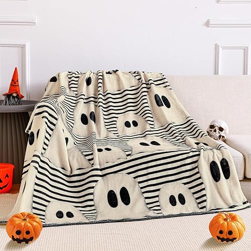 Halloween Throw Blanket Cute Rustic Ghost Flannel Blanket Farmhouse Spooky Blanket Soft Black White Striped Blanket Retro Halloween Decoration for Sofa Bed Holiday Party Gifts,50 x60(Ghost)
