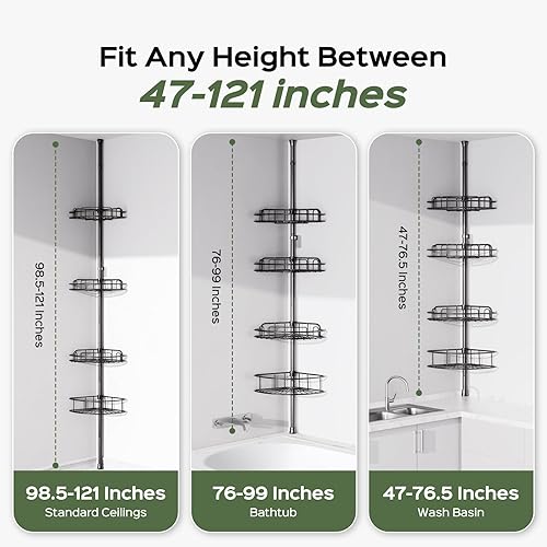 FITS ALL SHOWER HEIGHTS: With adjustable height (47-121 inches), this compact design shelf maximizes corner space for small space dwellers, renters, and budget-conscious shoppers. Pro Tip: After adjusting to the desired height, ensure all locking mechanisms are fully secured for maximum stability. Ideal for wall-mountable bathroom organizers and storage, ensuring your shower storage stays neat and accessible