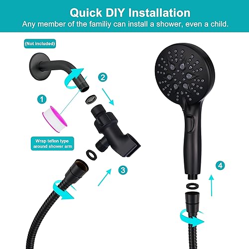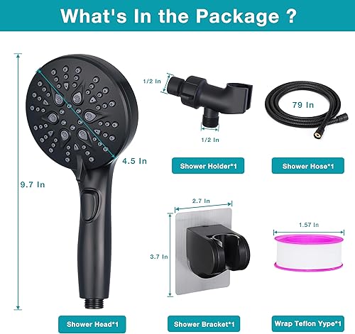 Multifunction Handheld Shower Head Set: The bathroom handheld showerhead features 7 spray modes , as well as the powerful wash and stop button that can meet all needs of shower or wash at your bathroom. The high flow shower head set with handheld includes the 4.5inch spray head, Long 79inch stainless steel shower hose, adjustable overhead bracket, low-reach adhesive shower holder and accessories like anti-leak Teflon tape and extra 2 washers.
