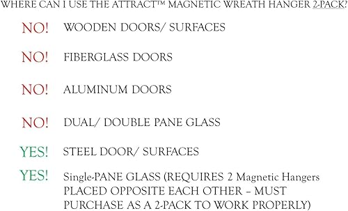 IMPORTANT NOTE: Magnetic wreath hanger 2-PACK is intended to be used together, by placing one on either side of the single-pane glass (such as a storm door) or it can also be used separately on metal doors/surfaces. This product will not work on thick double-pane glass such as a typical home window, or non-magnetic surfaces, such as wood and aluminum. Attract is a trademark of Haute Decor.