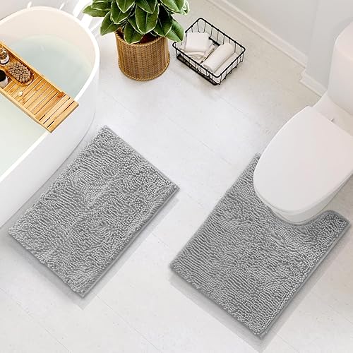 Hearth & Harbor Bathroom Rugs, Chenille Bath Mat - Machine Washable Bath Mats for Bathroom Non-Slip Backing Rubber, Quick Dry Bathroom Mat(17 x 24 + 20 x 24,Silver)