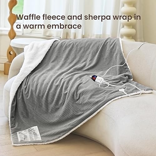 Heated Blanket Electric Throw Waffle, 50x60 Inches Sherpa Fleece Fast Heating Blanket 6 Heating Levels & 4 Hours Auto Off ETL Certification, Sage Throw(Light Grey,Twin 62" x 84")