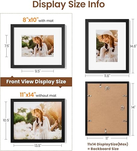 SIZE:The 8x10 picture frame perfect for the picture 8"x10",or display 5"x7" with mat.Please note that to hold the clear plexiglass and paper better,The front view display of the diploma frame will smaller 0.5".