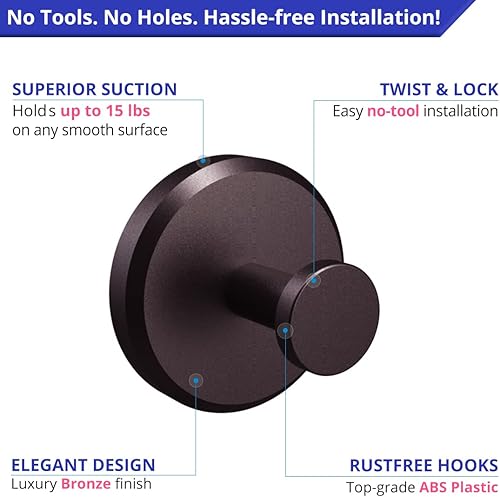 HOME SO Suction Cup Hooks for Shower, Bathroom, Kitchen, Glass Door, Mirror, Tile – Loofah, Towel, Coat, Bath Robe Hook Holder for Hanging up to 15 lbs – Waterproof & Rustproof, Matte Black (2-Pack)(Dark Bronze,2)