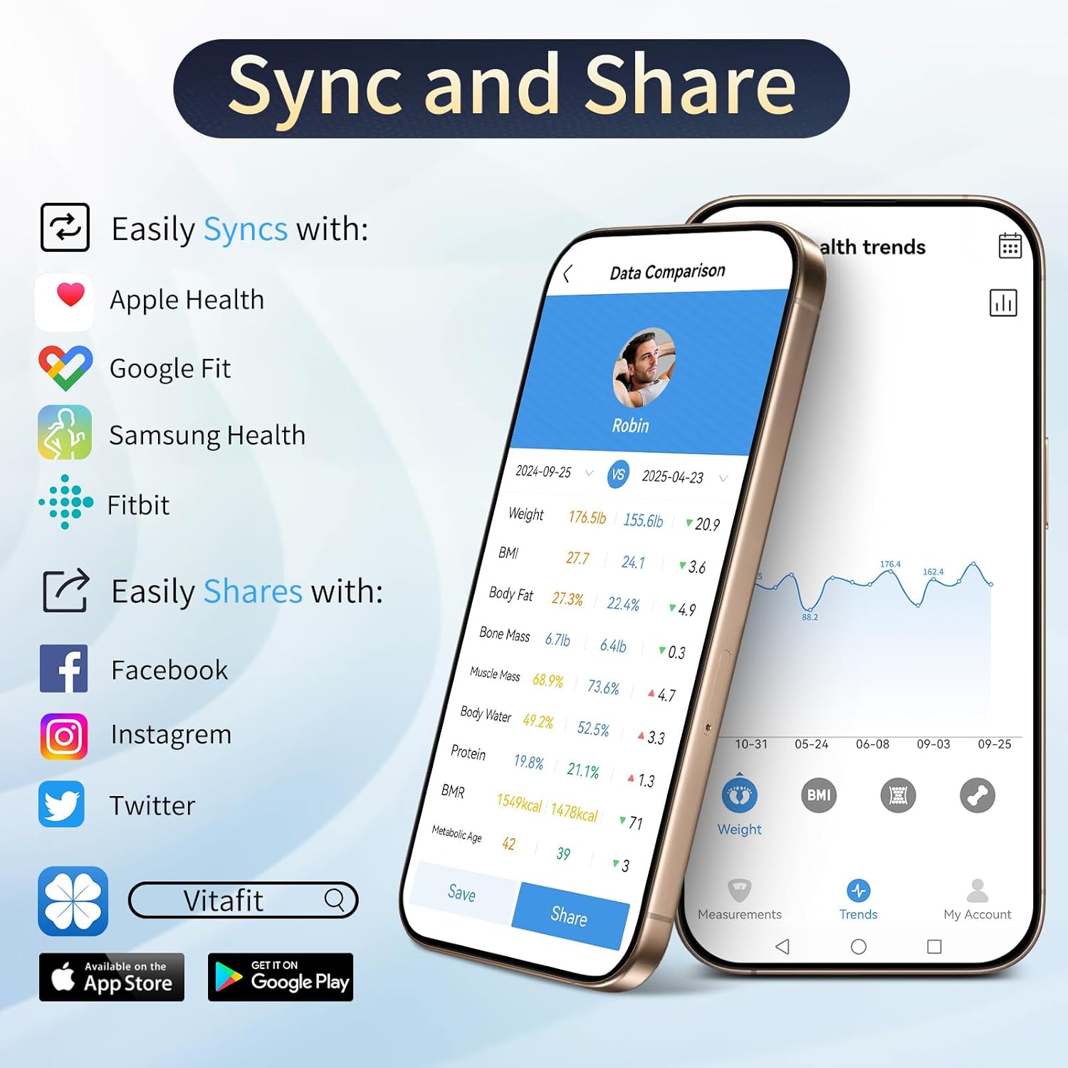 SYNC AND SHARE - Our app for bathroom scales for weight easily setting goals and tracking fitness progress graphs in daily, weekly, or monthly. And seamlessly SYNCS our app data with popular apps Apple Health, Google Fit, Samsung Health and Fitbit. Furthermore, conveniently share your happy healthy journey on major social media platform.