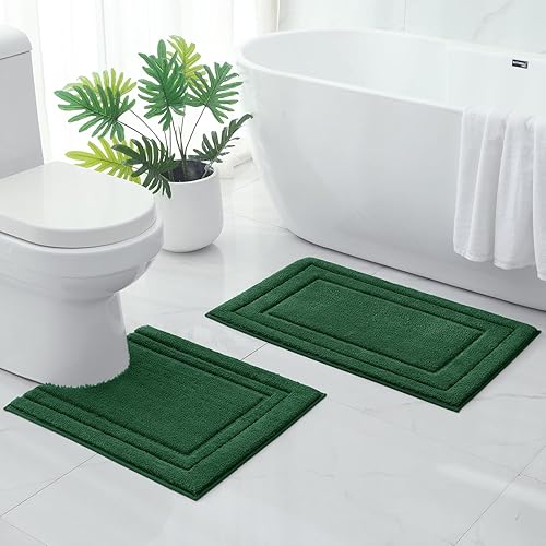 HOMEIDEAS Bathroom Rugs Sets 2 Piece, Super Soft and Absorbent Non Slip Microfiber Machine Washable Bath Mat Set (20" x 32" + 16" x 24", Grey)(Loop- Dark Green,1'8" x 2'8" (20"x32"+U Shape 20"x24"))