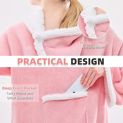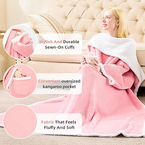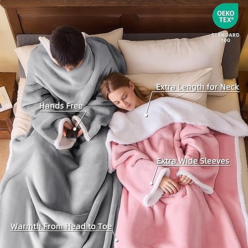 IFNOW Sherpa Wearable Blanket with Sleeves for Women Men Adults, Cozy Wearable Blanket with Arm and Pocket, Warm Full Body TV Wrap Throw Blanket, Soft Robe Blanket as Gifts for Mom Wife, Grey(Pink)