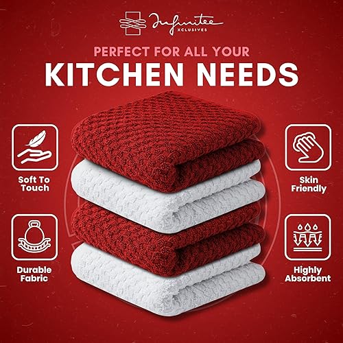 Infinitee Xclusives 100% Cotton Kitchen Towels - 15x25 Inch Ultra Soft Tea Towel, Super Absorbent Terry Dish Towels for Kitchen Linens |Grey|(Passionate Red,12 x 12 - Pack of 4)