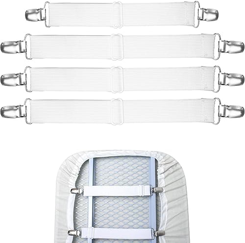 Ironing Board Cover Clips and Fasteners, Set of 4, Anti-Slip Straps for Secure and Tight Fit, Wrinkle-Free Iron Covers, Sheet Suspenders Clip for Bed, Sofa, Adjustable Length (White)(White)