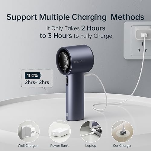 Brushless Motor - Super Power: The combination of a three-phase brushless motor and a 5000mAh battery significantly improves the wind speed, power, and endurance. The maximum wind speed can reach 9m/s. The highest rotation speed of the handheld fan is about twice that of a regular personal fan, reaching up to 15000 RPM. It can cool for 3-15 hours on a single charge