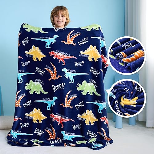 Joiedomi Glow in The Dark Blanket - Unicorns Gifts Toys for Girls Age 2 3 4 5 6 7 8 9 10 11 12 Year Old - Soft Cozy Flannel Kids Throw Blanket, Birthday Bedroom Decor 50"×60"(Blue Dinosaur,40" x 60")