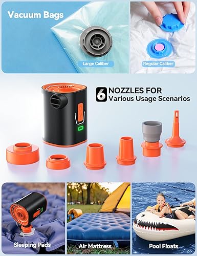 6 Nozzles Diverse Uses: Comes with six nozzles, suitable for most inflatable products, such as air mattresses, pool floats, vacuum storage bags, inflatable beds, sleeping pads, swimming rings, inflatable furniture and other inflatable toys