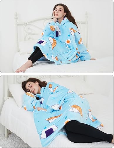 KFUBUO Wearable Blanket Hoodie for Adults Sherpa All Patterns Oversized Sweatshirt Blanket with Pockets Cute Birthday Gifts for Sister Strawberry(Blue Sushi,Adult)
