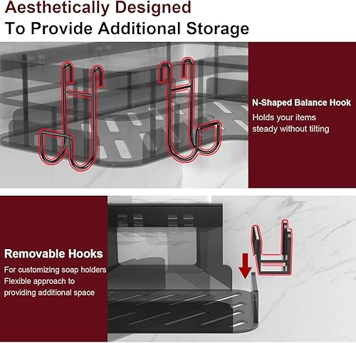 Humanized Customized 5 Metal Hooks & Detachable Soap Holder - 4 Customized N-shaped metal hooks and soap holder(1 additional removable metal hook customized for the soap holder)design solved storage problems. This Getsrichfc corner shower organizer leaves more room for bath sponges, razors, shower brushes and other washing accessories