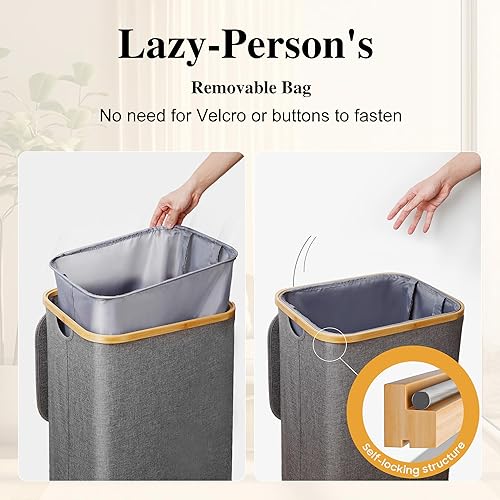 Large Laundry Hamper, 100L Waterproof Laundry Basket with Lid and Removable Bag, Collapsible Tall Clothes Hamper with Bamboo Handles for Clothes Toys in Dorm Bedroom Bathroom, Black(Grey,75L)